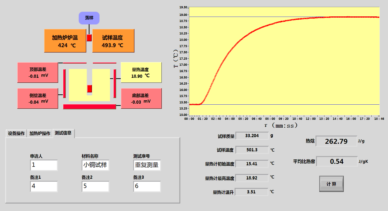 中溫比熱容測定儀由計算機進行自動檢測和控制,自動進行樣品溫度的監(jiān)控、電動開關控制試樣的整個下落過程、自動進行量熱計溫度的監(jiān)控以及自動進行測試結果計算。